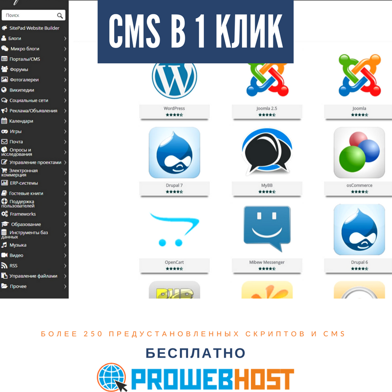 You will see the installation of most popular free CMS. Such as blogs, forums, CMS (content management system Joomla, Wordpress, Drupal, etc.), guest books, online shopping and more. More ...